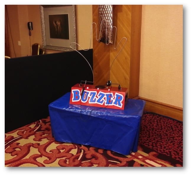 The aim of the giant buzzer game is to move the looped wand around the metal hand without touching it. Players get three lives, which are displayed by illuminated lights. For added pressure, players will also hear a 60 second heart beat timer that gets quicker and quicker. Each and every time the looped wand touches the metal hand; players will hear a warning sound and one of the lights will go out. If this happens 3 times or the player runs out of time the buzzer will sound a very distinctive failure sound and the game is over. However if the player manages to beat the buzzer then they will be greeted with a trumpet fanfare.