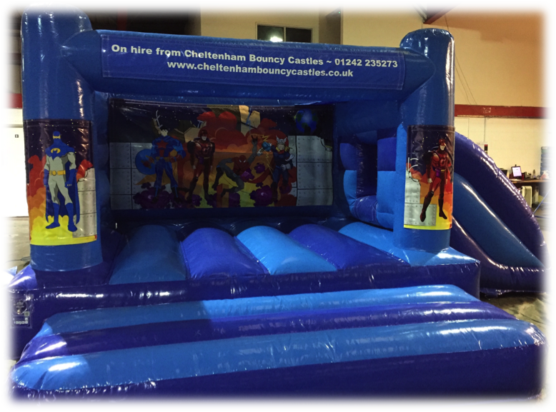 Super hero bouncy castle combi slide hire in Cheltenham, Tewkesbury, Gloucester, Cirencester and around Gloucestershire.
