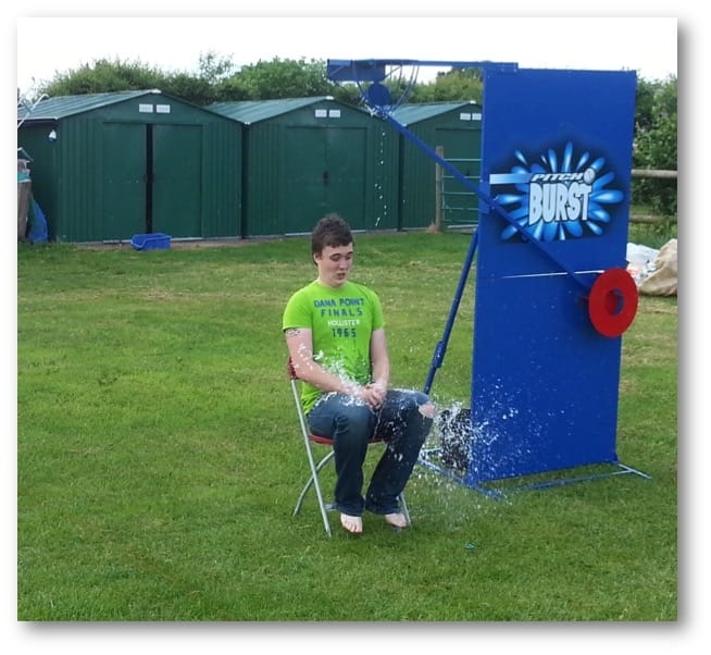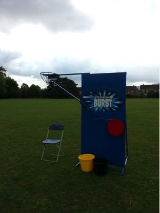 Pitch burst is totally free standing and only requires a space of 10ft by 12ft. Pitch burst is suitable for adults and children and a popular hire choice at company fun days, fund raising events and soak the teacher days!