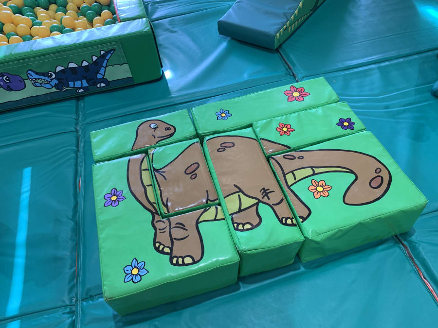 The dinosaur soft play comes complete with a dino dinosaur chunky puzzle comprising of 7 dinosaur puzzle blocks, an oversized up and over soft play dinosaur slide, various dinosaur soft play footprint blocks, a dinosaur themed soft play ball pit and to complete the dinosaur soft play set up, a set of dinosaur happy hoppers.