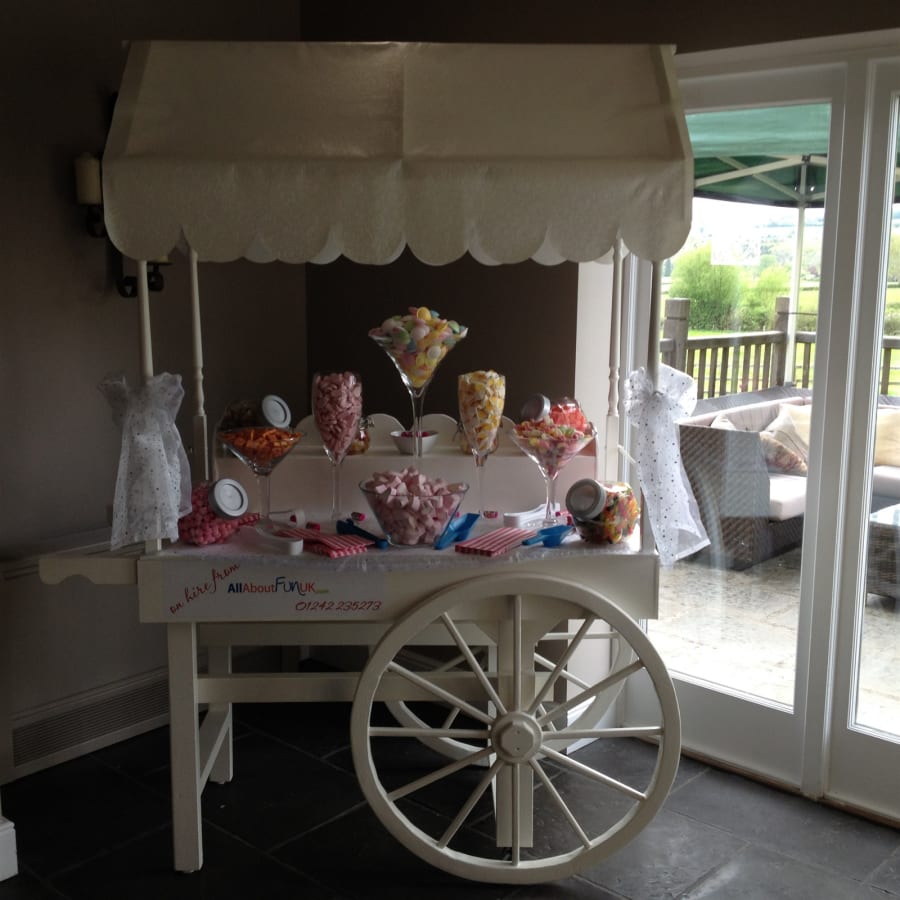 Candy cart hire. Hire a fantastic candy cart filled with all of your favourite sweet treats for a truly delightful affair. Available to hire at All about fun uk.com ~ the party and event hire company. 01242 235273.